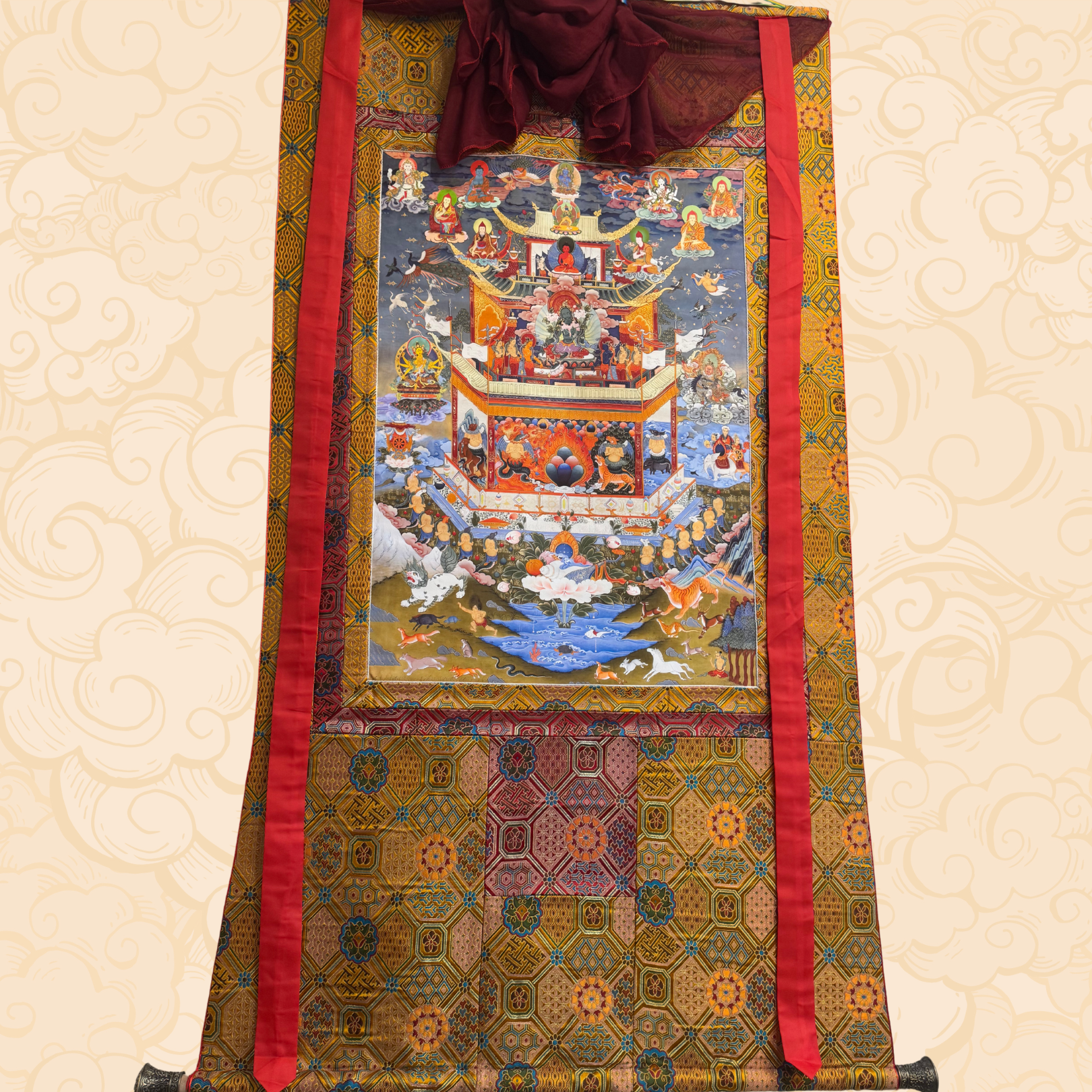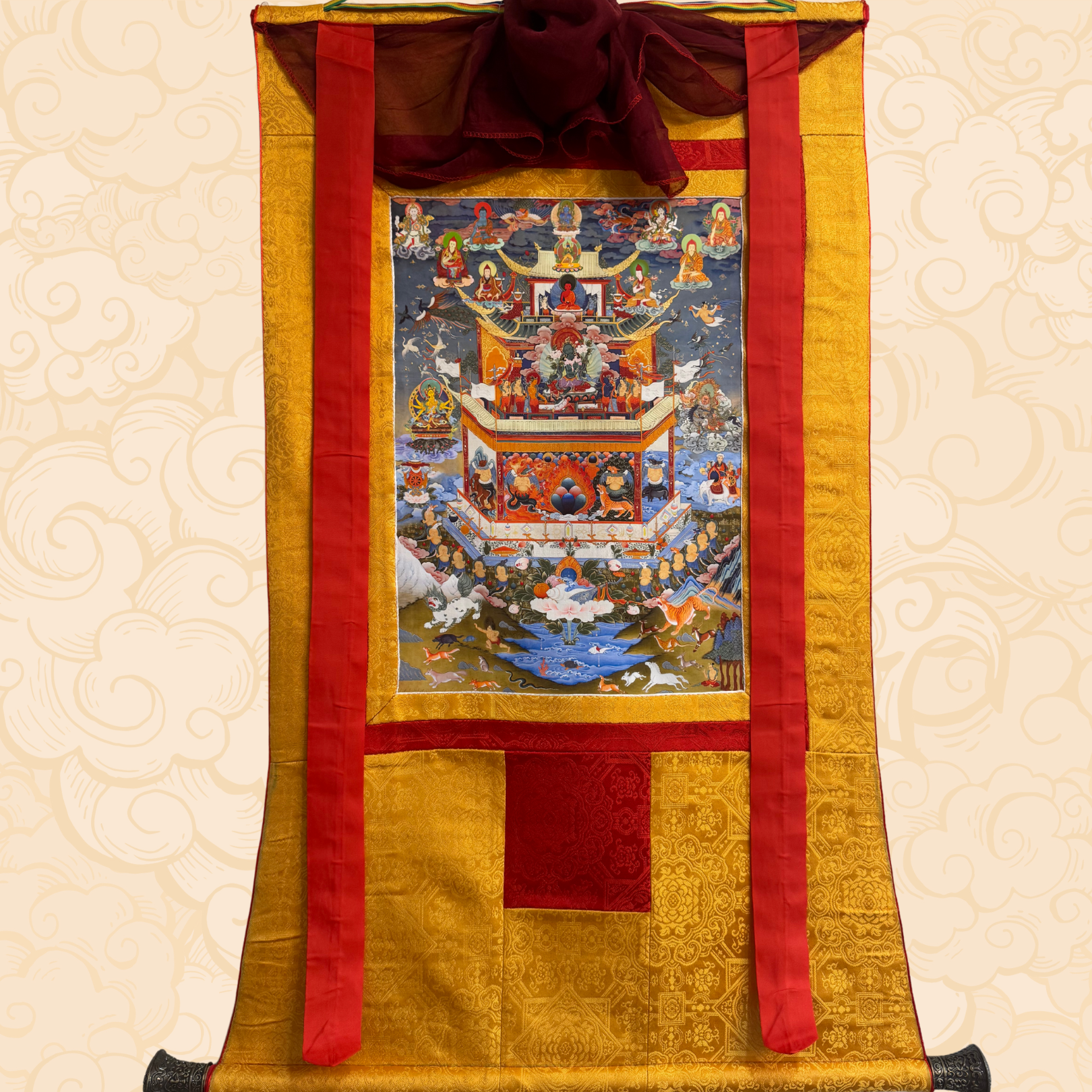 Package 3 Large Thangka Size $400 USD Large Sized Framed Brocade Thangka (select your fabric border color at checkout) Treasure Vase blessed at Tashi Chöthang in China (Lama Lutrin's monastery and again at the 2025 21 Tara Empowerment & Puja and Red Vaisravana Empowerment in California Auspicious Fortune Pillars Tara Mutak Flags EBook of Drolmi Kazug Puja Text Naga Offering Medicine Water Offering Substances for Dzambhalas |